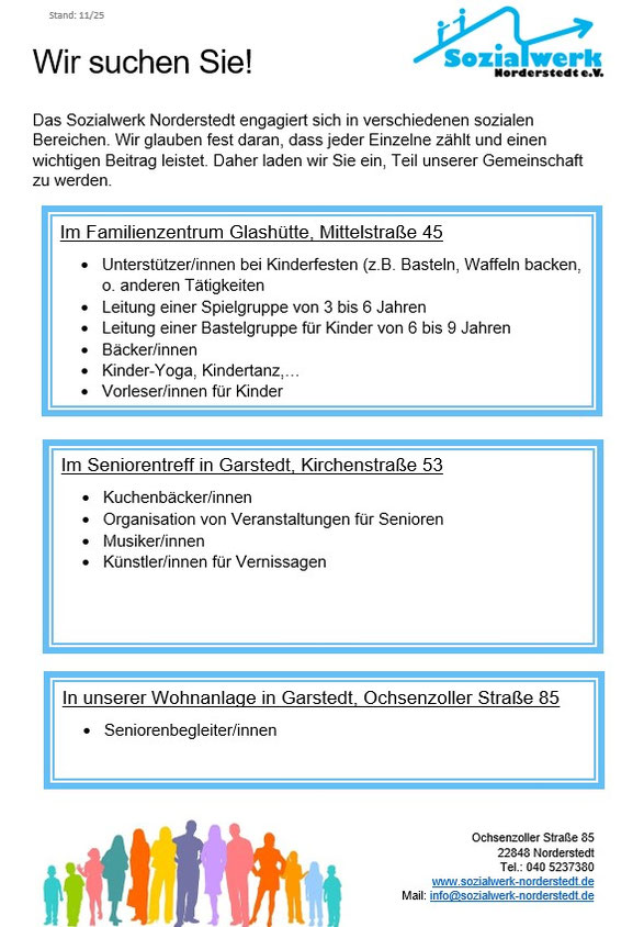 12. Juni 2023 Wir suchen Sie! Diese Informationen finden Sie auch im Flyer... Ehrenamt - Wir suchen Sie! Ehrenamt_Wir_Suchen_202511.pdf Adobe Acrobat Dokument 330.3 KB Download Haben Sie Fragen? Wir freuen uns auf Ihren Kontakt oder Anruf 040 / 523 73 80 info@sozialwerk-norderstedt.de Wir bieten tagPlaceholderTags: