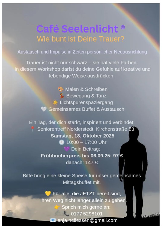18. Oktober 2025 Workshop im Café Seelenlicht am 18.10.2025 Haben Sie Fragen? Wir freuen uns auf Ihren Kontakt oder Anruf 040 / 523 73 80 info@sozialwerk-norderstedt.de zum Seniorentreff Garstedt tagPlaceholderTags: top-news, Veranstaltung-2025, Veranstaltung-202510