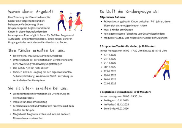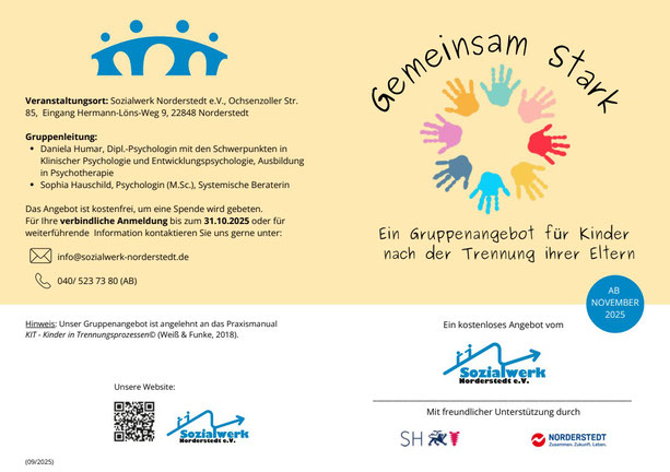 31. Oktober 2025 Gemeinsam Stark Ein Gruppenangebot für Kinder nach der Trennung ihrer Eltern Gemeinsam Stark - Ein Gruppenangebot für Kinder nach der Trennung ihrer Eltern PB_Gemeinsam Stark_20251004.pdf Adobe Acrobat Dokument 491.9 KB Download Haben Sie Fragen? Wir freuen uns auf Ihren Kontakt oder Anruf 040 / 523 73 80 pb@sozialwerk-norderstedt.de Psychologische- und Erziehungsberatung tagPlaceholderTags: Psychologische-Beratung, top-news, Veranstaltung-202510, Veranstaltung-202511