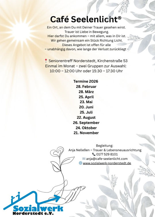 12. November 2025 Café Seelenlicht Termine 2026 Haben Sie Fragen? Wir freuen uns auf Ihren Kontakt oder Anruf 040 / 523 73 80 info@sozialwerk-norderstedt.de zum Seniorentreff Garstedt tagPlaceholderTags: top-news