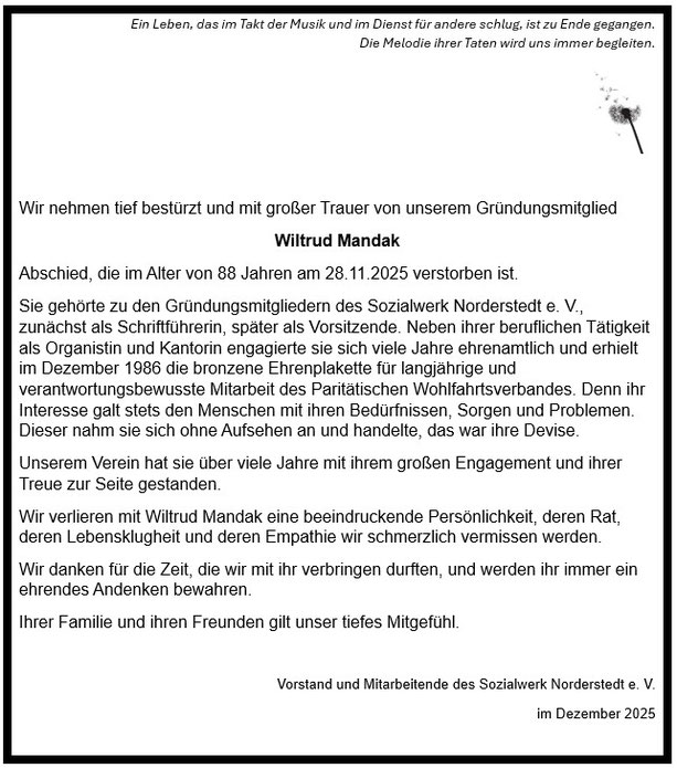 10. Dezember 2025 Nachruf - Frau Wiltrud Mandak Haben Sie Fragen? Wir freuen uns auf Ihren Kontakt oder Anruf 040 / 523 73 80 info@sozialwerk-norderstedt.de tagPlaceholderTags: top-news